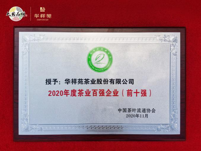 今年11月,在第十六届中国茶叶经济年会上,华祥苑获得中国茶叶流通协会颁发的“2020年度茶业百强企业(前十强)”荣誉称号。